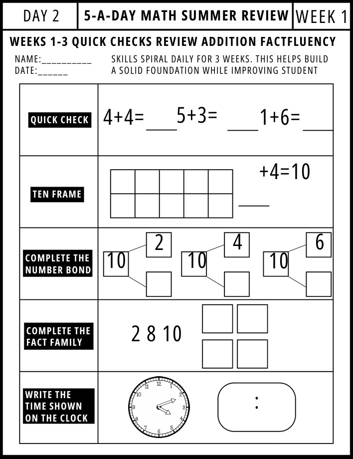 Each page includes a balanced mix of addition facts, number bonds, fact families, ten frames, and telling time, providing structured review while strengthening problem-solving and mathematical thinking. The consistent routine supports retention and prevents summer learning loss, making it ideal for home practice, summer school, intervention, and math centers.