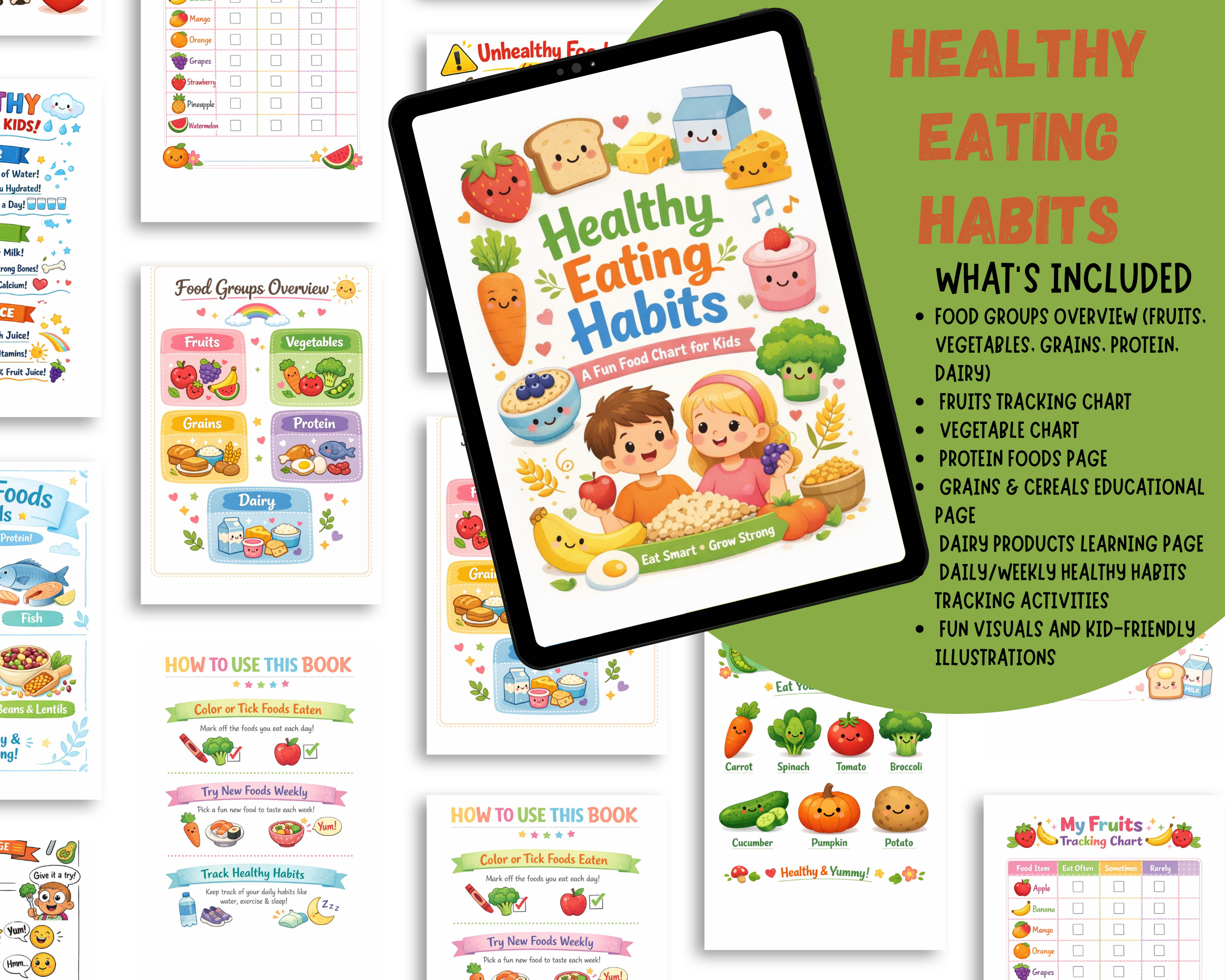 Packed with interactive charts, food group activities, and habit trackers, this printable workbook helps children understand what they eat, make better choices, and build lifelong healthy routines—all while having fun.