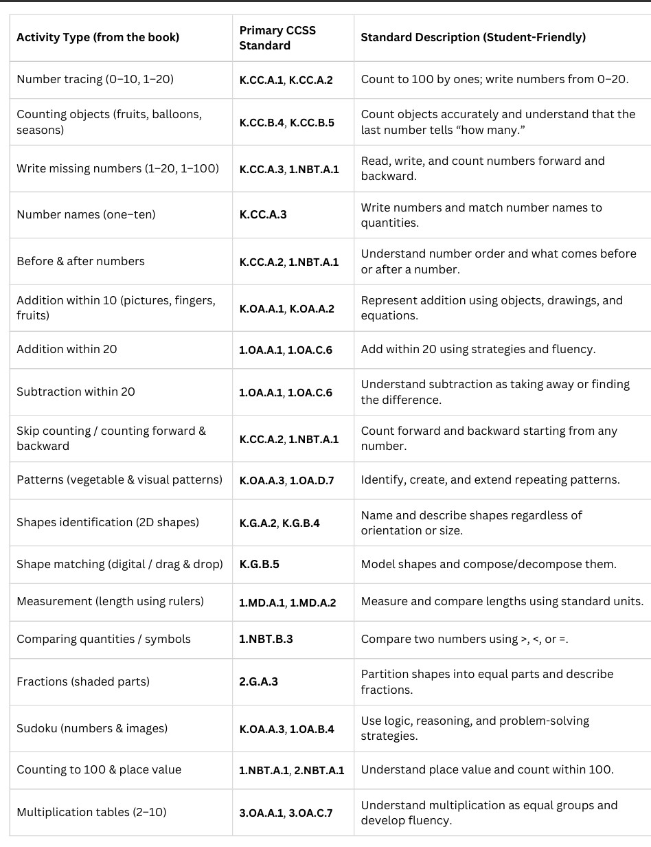 Children will practice tracing numbers, counting objects, solving fun puzzles like Sudoku, comparing quantities, exploring shapes, and building confidence with step-by-step math drills. The variety keeps learning fresh while gently strengthening focus, logic, and problem-solving skills.