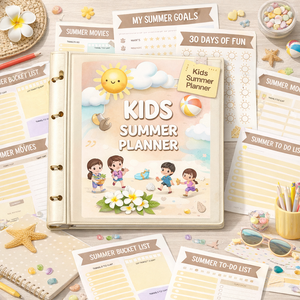 Turn “I’m bored” into “Let’s explore!” with this 30+ page interactive summer planner. Designed to keep kids aged 4–9 engaged, organized, and inspired, it features everything from daily routine trackers and “Boredom Buster” jars to summer bucket lists and memory-keeping journals.