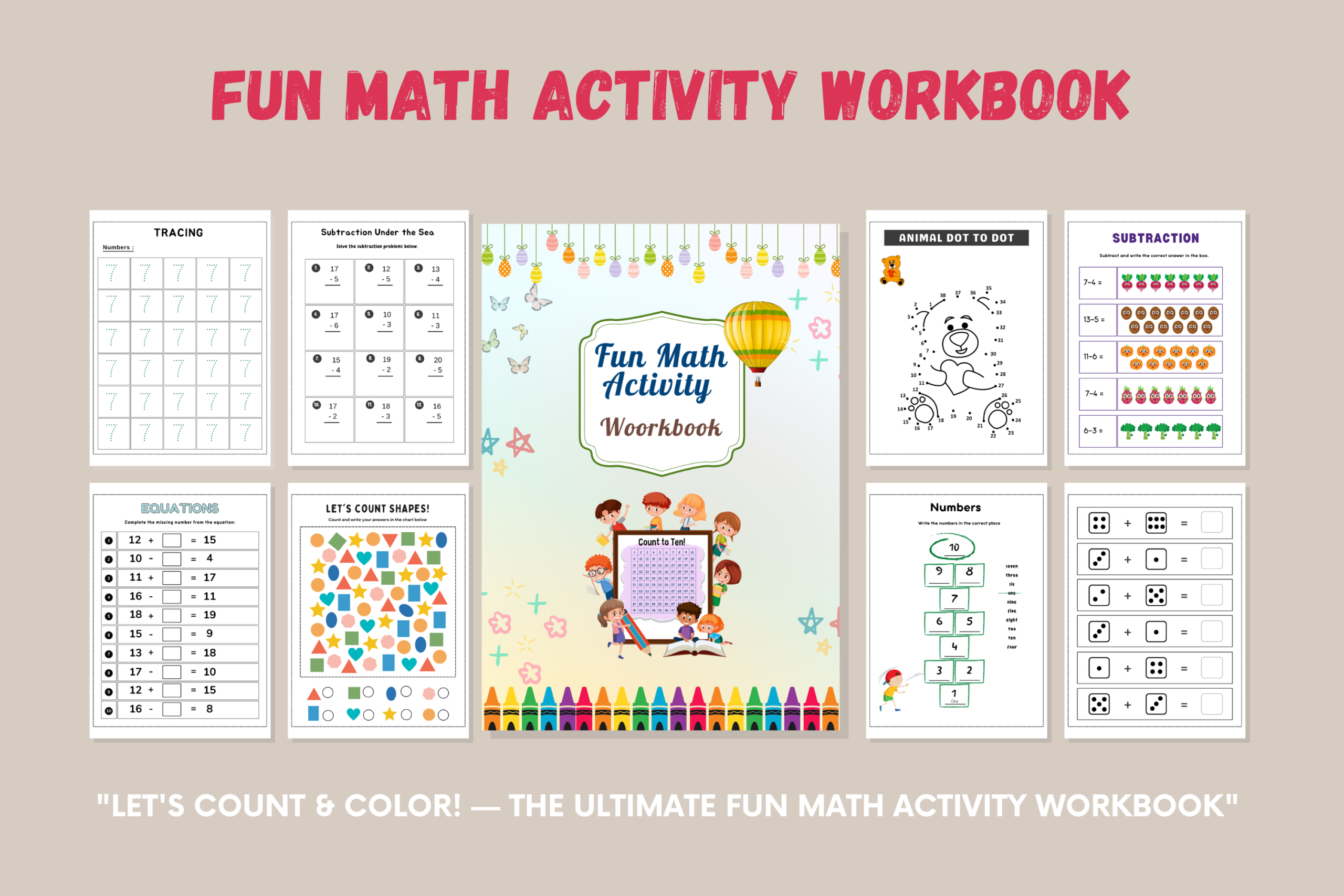 Introducing “Let’s Count and Color!” — the most joyful, colorful, and skill-packed math workbook your young learners have ever seen! With 72 beautifully illustrated pages, this workbook takes children on a magical journey through numbers 1–20, counting, tracing, addition, subtraction, equations, number bonds, and even animal dot-to-dot art activities!