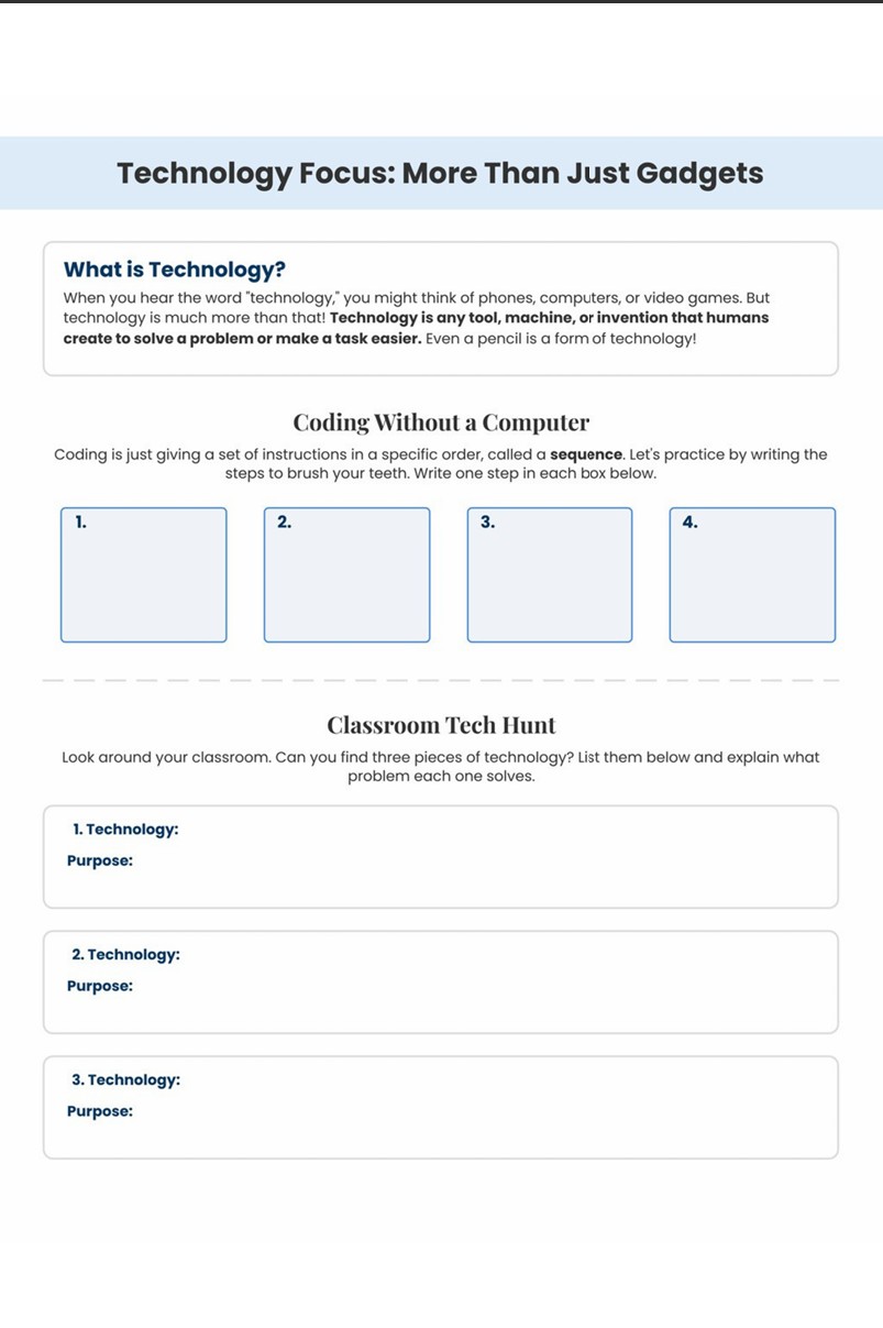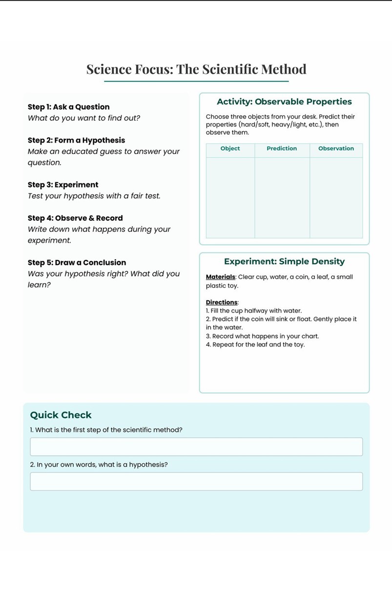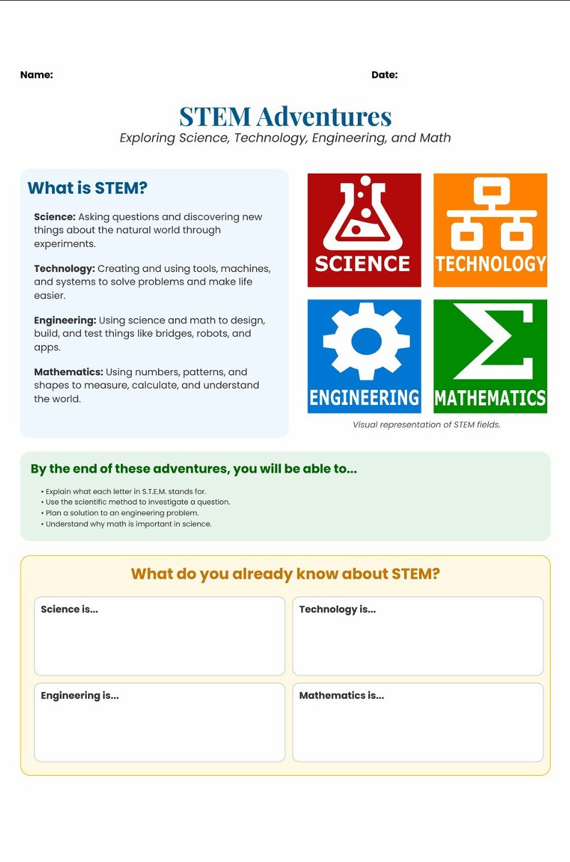 Learners explore exciting topics like water filtration, space science, environmental testing, engineering design, coding concepts, and STEM careers. Each activity encourages students to ask questions, plan solutions, record data, and reflect on their learning—just like real scientists and engineers.