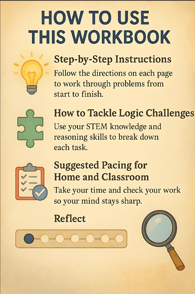 Level up your child’s brainpower with the STEM Mind-Benders Workbook—a hands-on activity book designed to build logic, problem-solving, and creative thinking skills in a fun, screen-free way. Packed with puzzles, challenges, and real STEM scenarios, this workbook helps young learners think like scientists, engineers, and innovators.