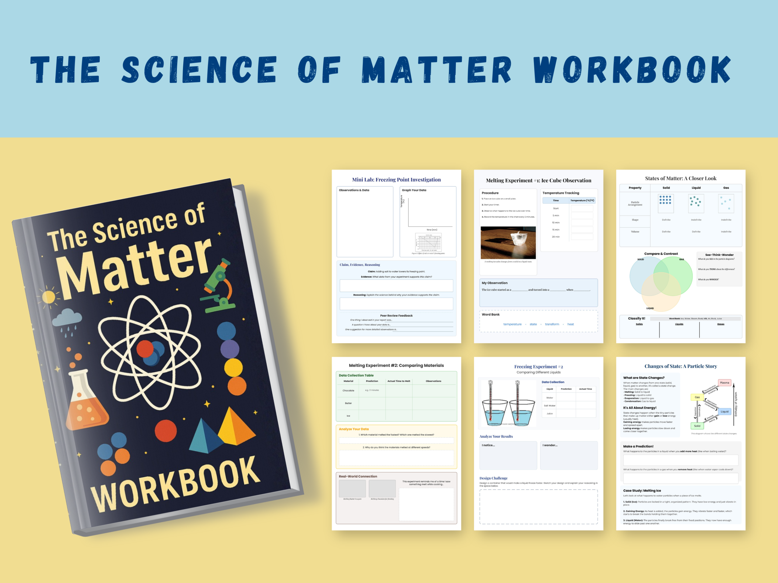 Perfect for classrooms or homeschooling, each page guides children step-by-step to discover how particles behave, how materials change state, and why matter is everywhere around us. The book includes melting & freezing labs, evaporation investigations, data tables, and reflection prompts that build true scientific thinking.